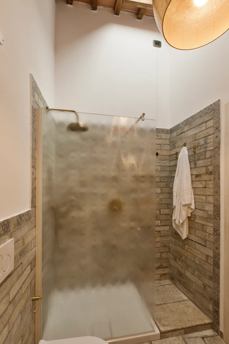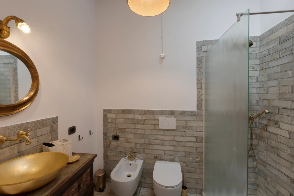 L’appartamento ha 1 bagno con doccia, lavandino e bidet, con finestra a tetto ad apertura telecomandata.