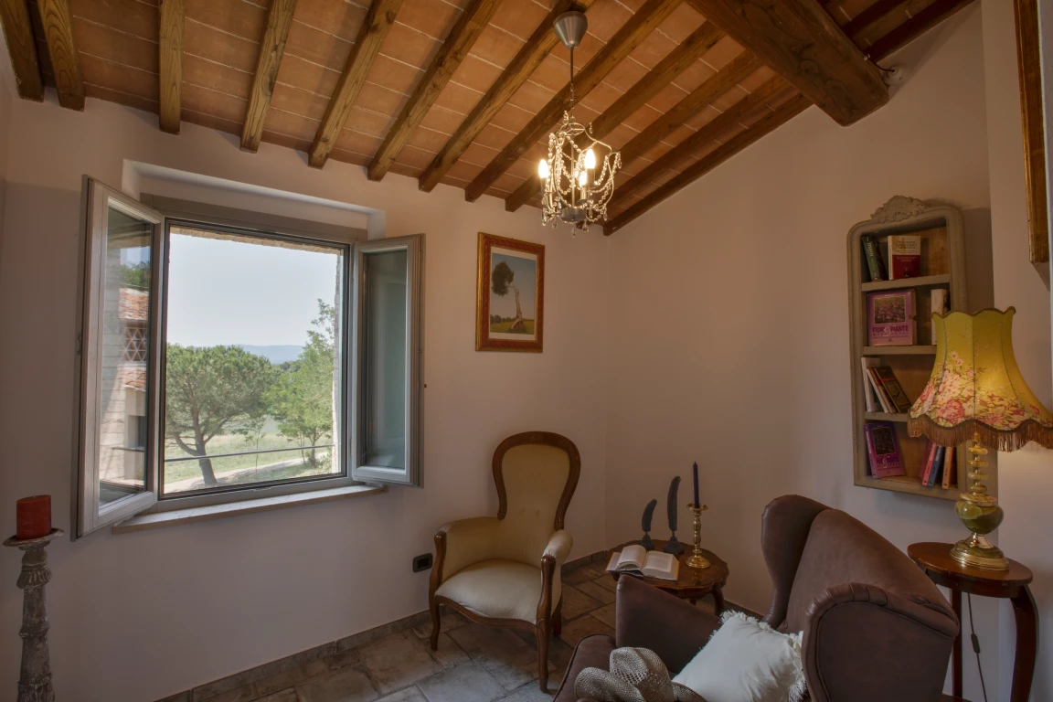 Salotto con poltrone  e lampada per leggere, con finestra con vista sul giardino antistante.