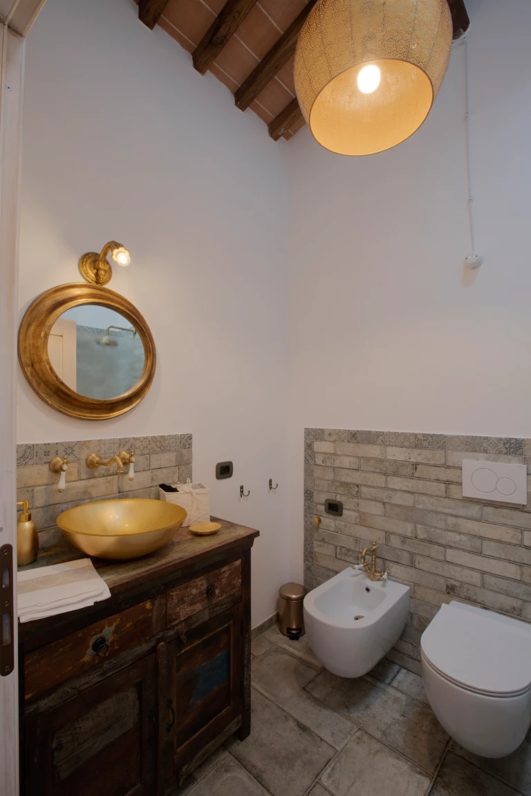 L’App al primo piano, a cui si accede da scala esterna in travertino toscano e da ingresso privato, è costituito da una camere tripla, ( letto matrimoniale e letto singolo), 1 bagno con doccia, cucina, salotto, terrazzino, gazebo privato accanto alla scala di entrata.